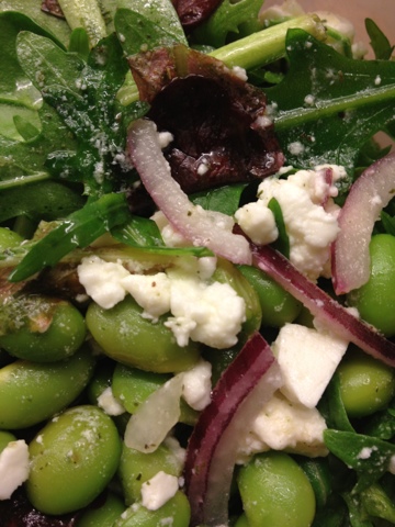 Blanda tomater och bönor med olivolja och vinäger. Smaka av med salt och peppar. Vänd ner salladsbladen och osten och servera genast, gärna med ett gott surdegsbröd.